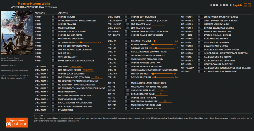 몬스터 헌터 월드 트레이너 v20200109-v20200603.Plus.67.trainer 입니다.