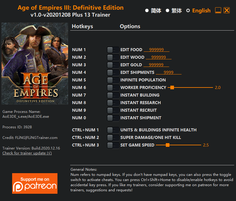 에이지 오브 엠파이어3 : 디피니티브 에디션 v2020.12.08 트레이너 입니다.