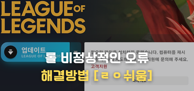 [롤] 업데이트 오류 에러 해결 방법 : 리그오브레전드 롤 업데이트시 필요한 파일을 설치하지 못했습니다. 컴퓨터를 재시작한 후 다시 시도하거나, 고객지원에 문의해 주세요. 리그오브레전드 롤 업데이트시 필요한 파일을 설치하지 못했습니다. 컴퓨터를 재시작한 후 다시 시도하거나, 고객지원에 문의해 주세요. 라는 경고가 뜨면서 재시작을 해도 설치가 진행되지 않습니다. 해당 오류 에러 보신적 있으시죠?Riot Vanguard 라이엇 뱅가드 오류 문제 입니다. 간단한 해결방법 알려드릴게요.오류 문구가 뜨면서 업데이트가 안되시는 분들은 당황하지마시고 따라하시면 됩니다.해결방법 정말 간단합니다. 라이엇 뱅가드 업데이트 오류 에러 해결방법 1. 윈도우 우측 하단 뱅가드 마우스 오른쪽 클릭 -> Exit Vanguard 끝 입니다. 당황스러우시죠?뱅가드 종료 후 업데이트 버튼 누르면 아무 문제없이 업데이트가 됩니다. 업데이트 완료 후 정상적인 클라이언트 화면입니다. 하지만 롤을 실행.. 게임 정보 2025.03.12